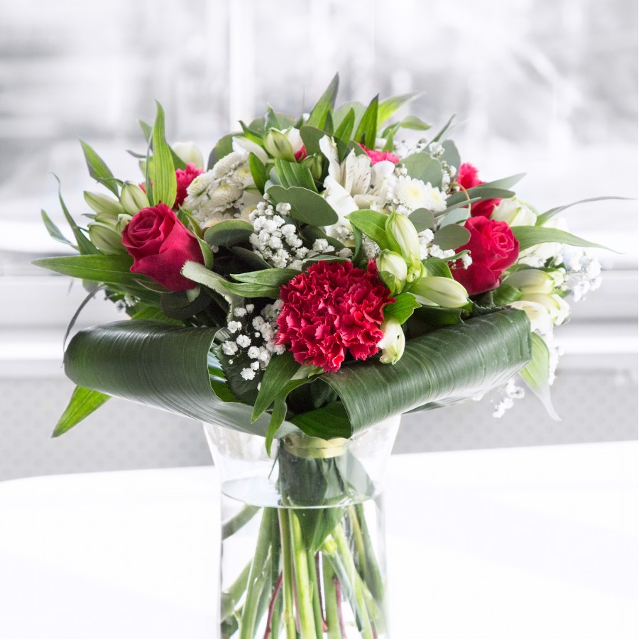 Indulge in the timeless beauty of our exquisite bouquet, designed to captivate and inspire. Featuring rich red roses and fragrant white chrysanthemums, complemented by gypsophila for a delicate touch.