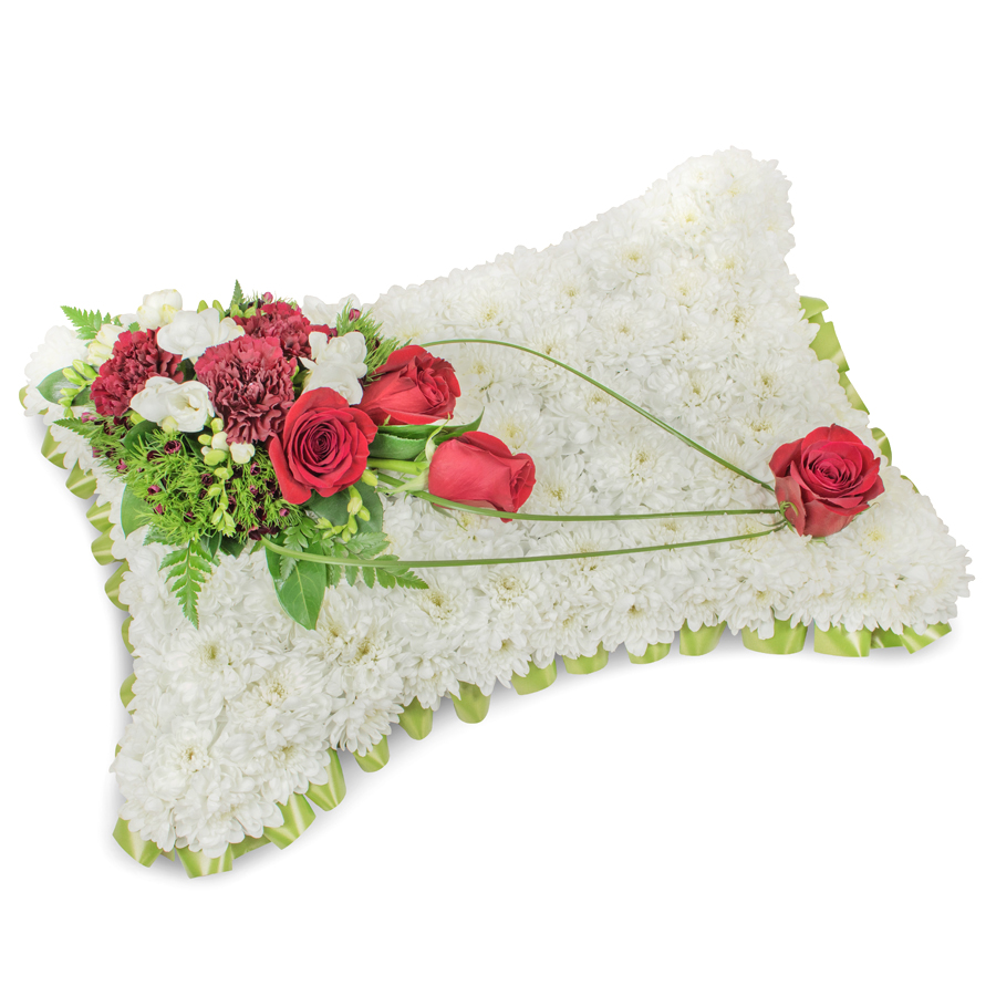 Designed to convey comfort and support, this floral cushion is ideal for funerals, memorials, and remembrance services. Measuring approximately 45cm x 60cm (18" x 24"), it creates a striking yet tasteful display that looks beautiful on the casket or tribute area. Each rose is delivered with its natural guard petals intact to protect the inner bloom during transit; these can be gently removed on arrival for a flawless finish.
